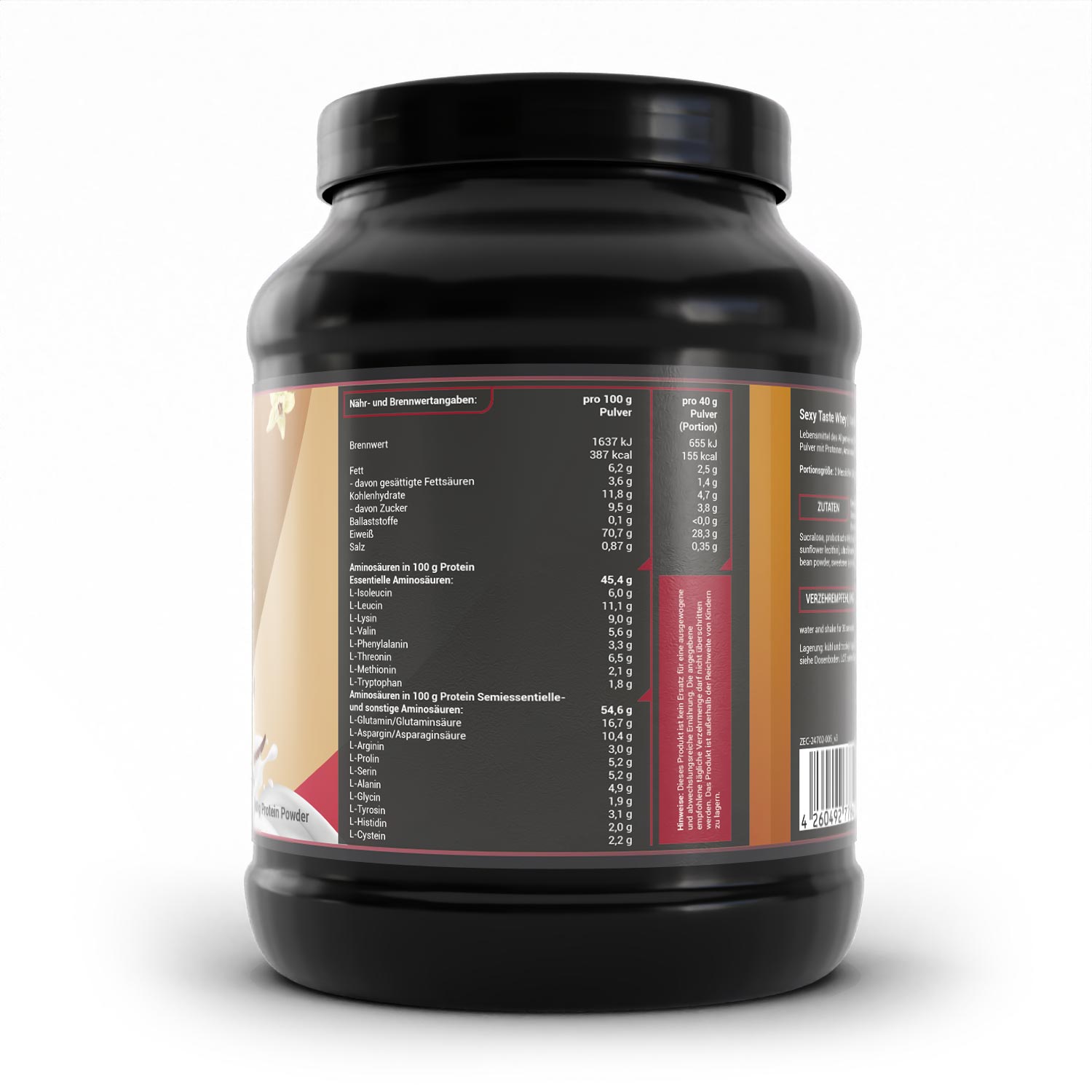 SEXY TASTE WHEY enthält zum einen die essentiellen, also lebensnotwendigen Aminosäuren Isoleucin, Leucin, Lysin, Valin, Phenylalanin, Threonin, Methionin und Tryptophan, die vom Körper nicht selbst gebildet werden können. Zum anderen sind zahlreiche semi- und nicht essentielle Aminosäuren enthalten - und das allesamt als hochwertige L-Form!