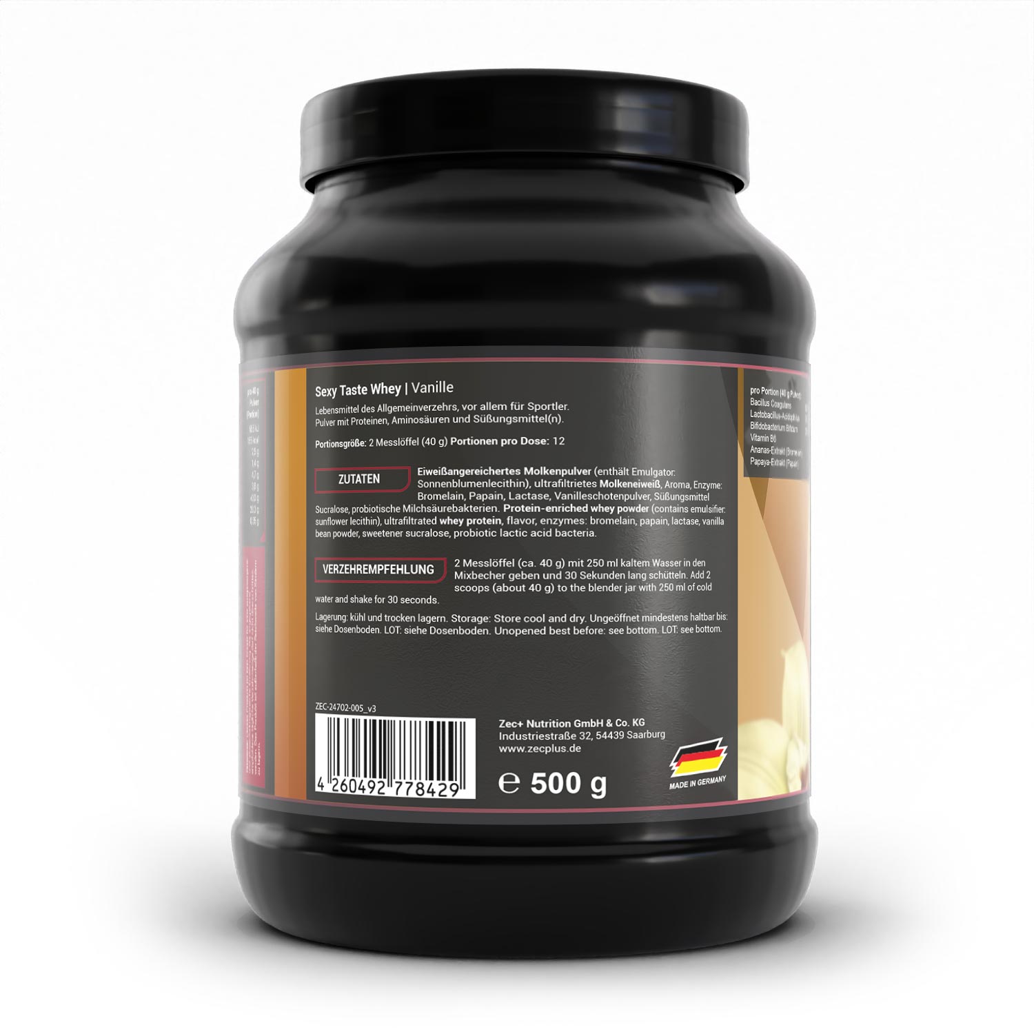 Molkenprotein (enthält Emulgator: Sonnenblumenlecithin), ultrafiltrietes Molkeneiweiß, Aroma, Enzyme: Bromelain, Papain, Lactase, Vanilleschotenpulver, Süßungsmittel Sucralose, probiotische Milchsäurebakterien.