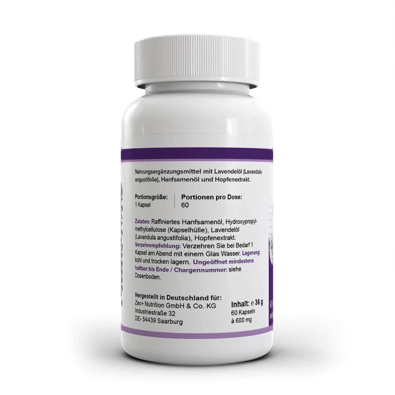 Raffiniertes Hanfsamenöl, Hydroxypropylmethylcellulose (Kapselhülle), Lavendelöl (Lavandula angustifolia), Hopfenextrakt