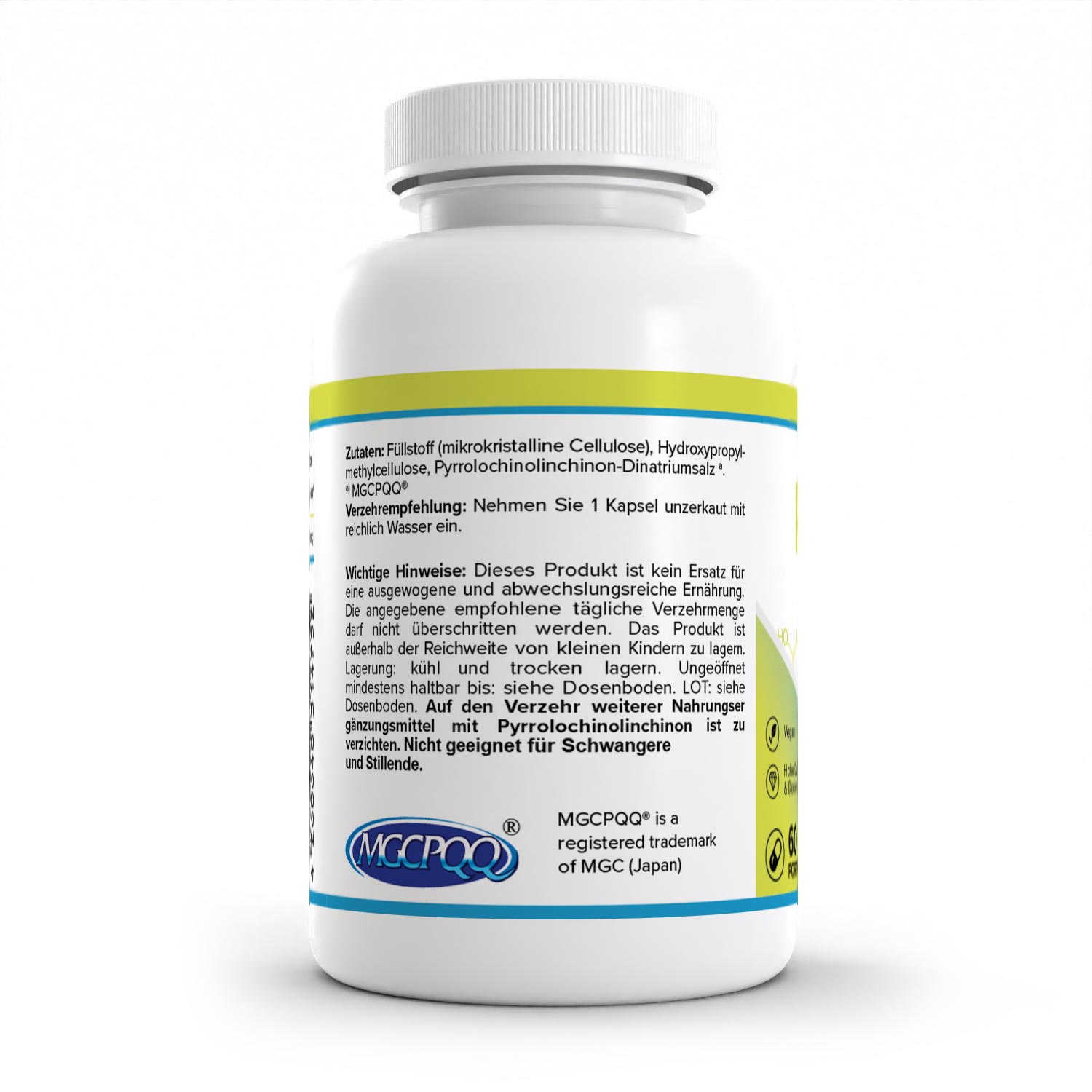 Zutaten: Füllstoff (mikrokristalline Cellulose), Hydroxypropylmethylcellulose, Pyrrolochinolinchinon-Dinatriumsalz (MGCPQQ®).